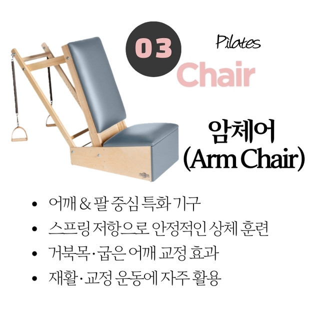암체어는 그 중에서도 비교적 단순한 구조를 가지지만, 상지와 흉곽, 그리고 호흡의 통합적 훈련이라는 점에서 필라테스 전통 기구 중 독특한 위치를 차지합니다. 과거에는 흔히 사용되지 않았지만, 최근에는 어깨 재활, 흉곽 확장, 호흡 패턴 교정을 위한 전문 스튜디오 프로그램에서 다시 조명받고 있습니다.