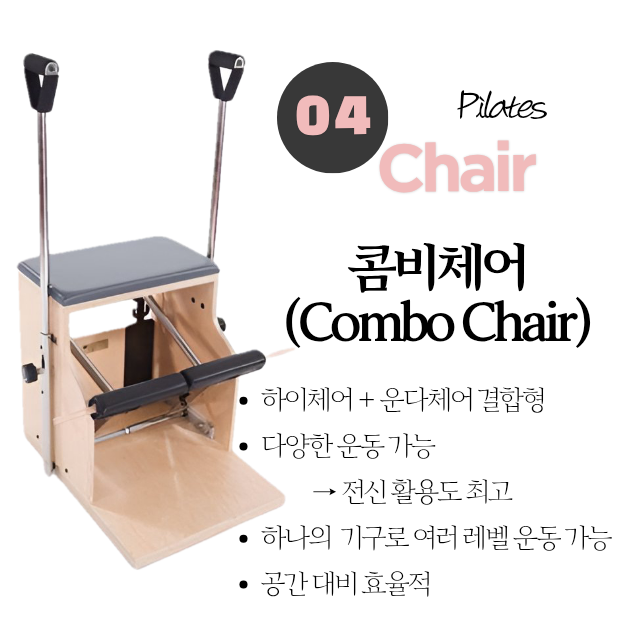 필라테스의 창시자 조셉 필라테스(Joseph Pilates)가 고안한 기구 체어 라인의 발전형입니다. 원래 필라테스 체어는 운다체어(Wunda Chair)와 하이체어(High Chair)로 구분되었으나, 이후 두 장비의 장점을 결합한 형태로 콤비체어가 개발되었습니다.