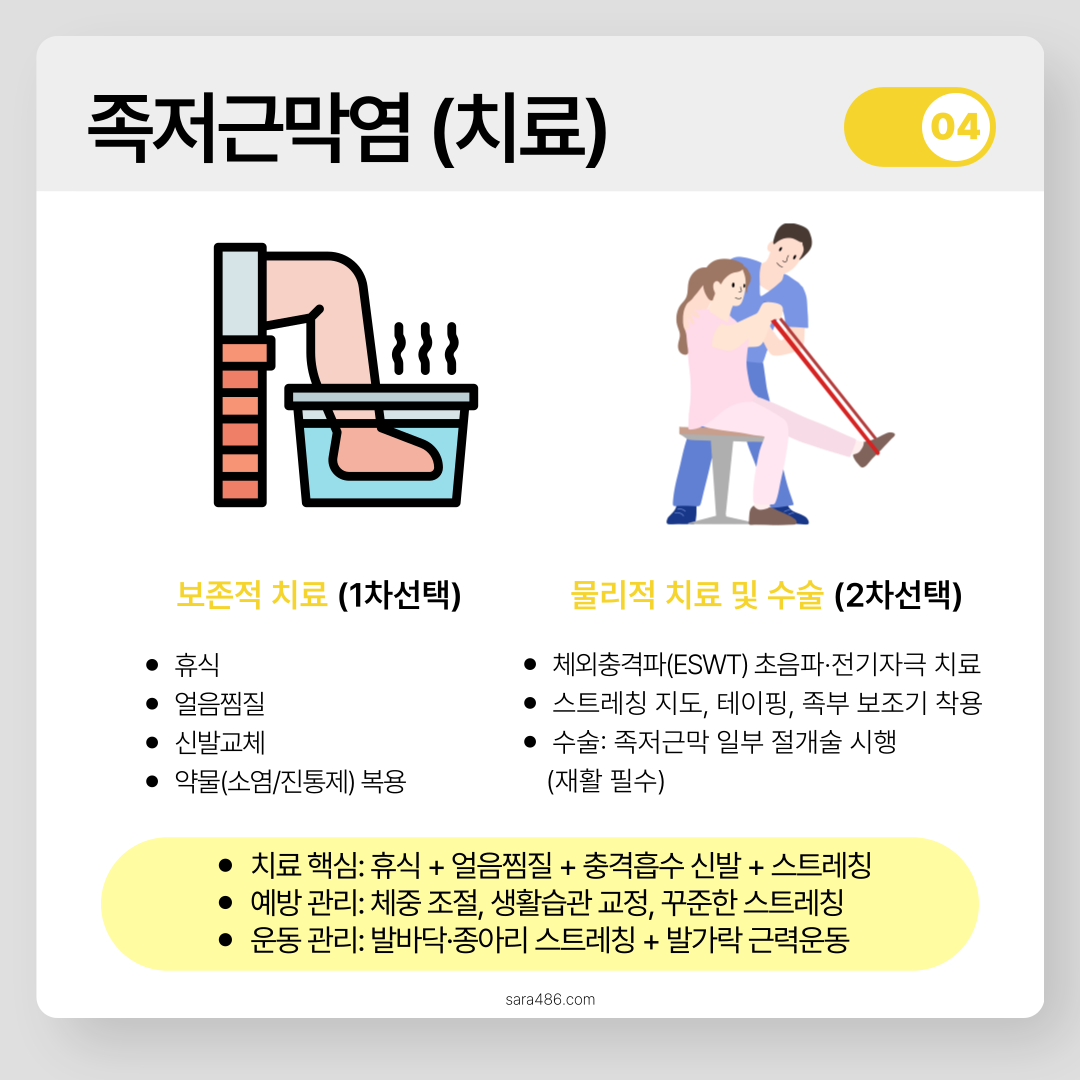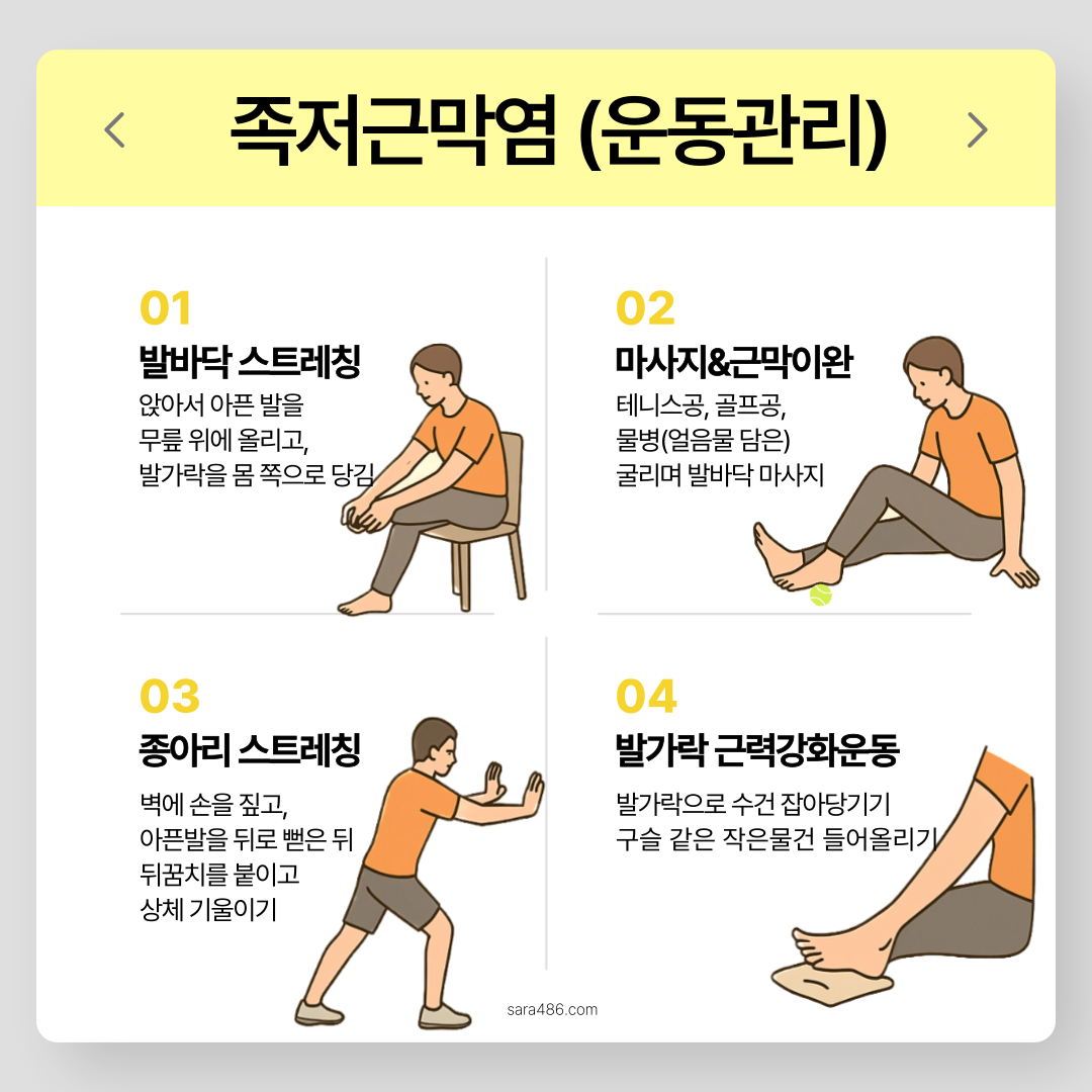 - 스트레칭 습관: 기상 직후, 운동 전후 발바닥과 종아리 스트레칭