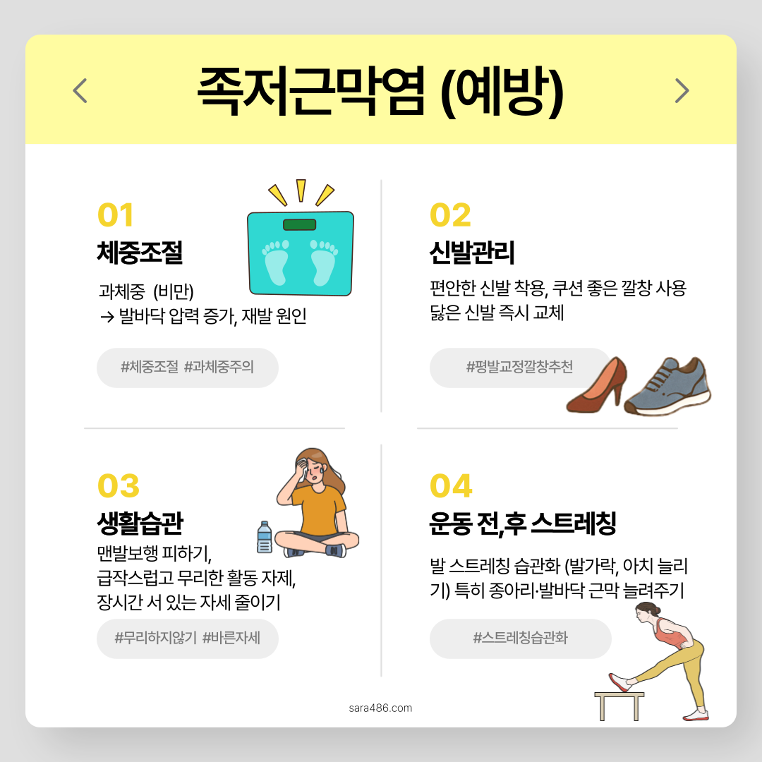 족저근막염은 생활 습관을 조금만 바꿔도 예방할 수 있습니다. 특히 직업적으로 오래 서 있는 분들이나 운동을 즐겨 하는 분들은 평소 관리가 매우 중요합니다.